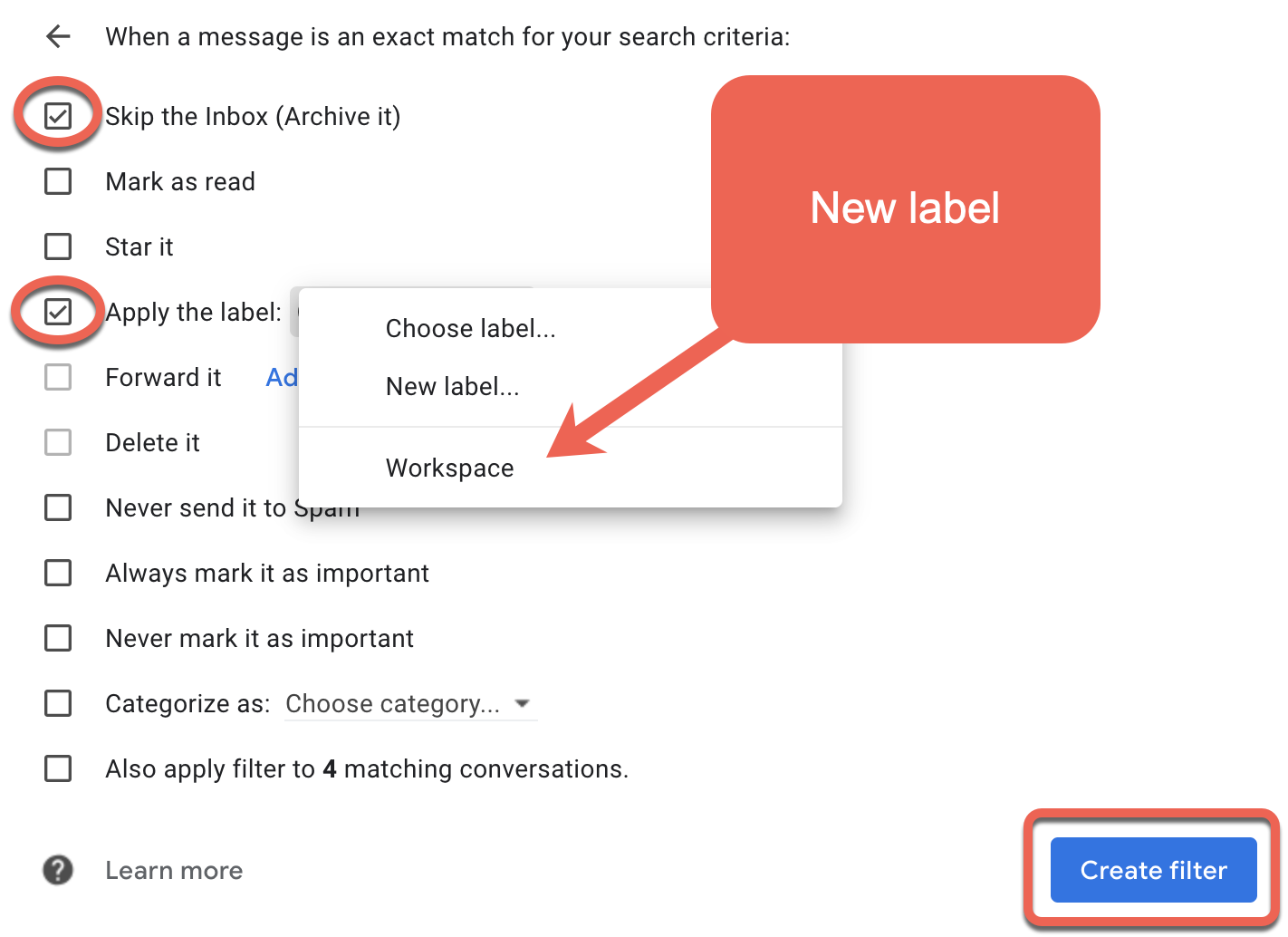 e. On next page, check the Skip the Inbox (Archive it) and Apply the label checkboxes